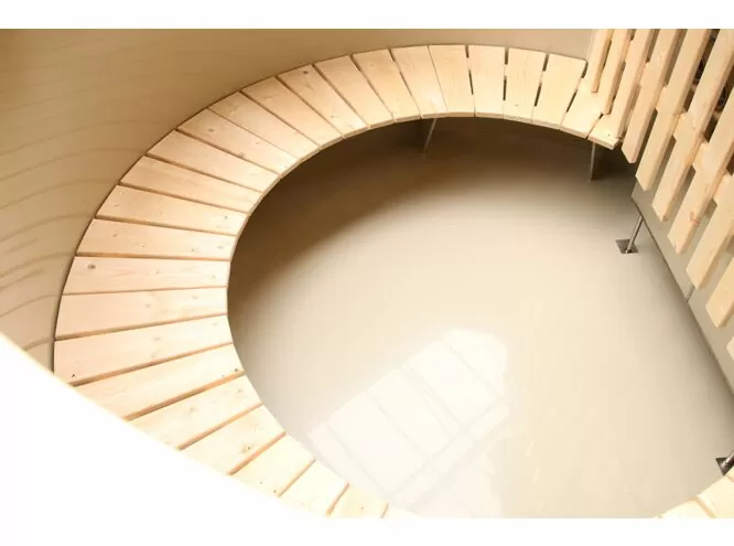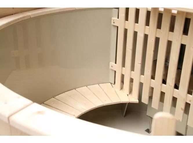 Product description: Experience ultimate wellness with a wood-fired hot tub. Soak in warm water surrounded by nature, in a tub crafted from durable spruce wood with stainless steel clamping straps and a wooden stove. Enjoy wooden benches, a protective barrier, and a shelf that doubles as a mini bar. The hot tub includes a wooden cover, steps, and a paddle for even temperature distribution. Indulge in luxury and relaxation with this exquisite hot tub.